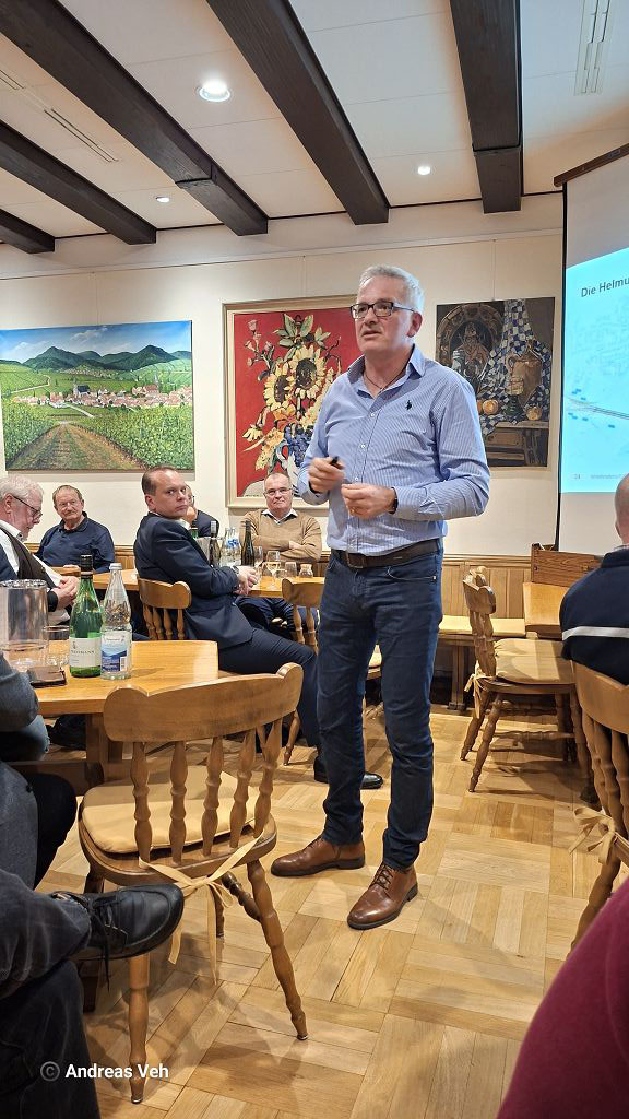 Ein außergewöhnliches Essensangebot und ein interessantes Vortragsthema lockten am vergangenen Montag ca. 90 Weinbrüder in unser Ordenshaus. Sie alle mussten ihr Kommen sicherlich nicht bereuen. Beides passte: Die vorzügliche Hirschhaxe mit passenden Beilagen (großes Kompliment an unser Küchenteam!) und der sehr interessante Vortrag zum Thema „Das Hochstraßensystem in Ludwigshafen“. Dieser wurde gehalten von einem absoluten Spezialisten, unserem Weinbruder Eberhard Küssner, der sich in seiner kurzen Vita als „Gesamtprojektleiter für das Hochstraßensystem Ludwigshafens“ vorstellte. Entsprechend professionell und profund erläuterte er in seinem ausführlichen Vortrag die Neugestaltung des Ludwigshafener Hochstraßensystems, insbesondere dessen nördlichem Teil: Abriss der derzeitigen Hochstraße einschließlich „Rathauscenter“ und „Würfelbunker“, Neubau der etwa ein Kilometer langen Stadtstraße, der „Helmut-Kohl-Allee“, bis hin zu deren Anbindung an die Kurt-Schumacher-Brücke („Nordbrückenkopf“). Immer wieder visualisiert durch entsprechende Bilder, Pläne und kurze Filmsequenzen, erklärte er äußerst detailliert u.a. die Abrissarbeiten, die Arbeiten „unter Tage und die anstehenden Straßen- und Brückenkonstruktionen. Dabei wies er auch auf zusätzliche Probleme hin, die im Vorfeld der eigentlichen Arbeiten bewältigt werden mussten, z.B. die Suche und das Entschärfen von Weltkriegsbomben oder die „Evakuierung“ einer großen Anzahl von Eidechsen und deren Wiederansiedlung auf Ersatzhabitaten („Eine Eidechse hat das Recht auf 80m² Wohnfläche“ ((Zitat Küssner)). Auch die bevorstehenden verkehrstechnischen Probleme und ihre Lösungsmöglichkeiten waren ein Teil seines Vortrags.