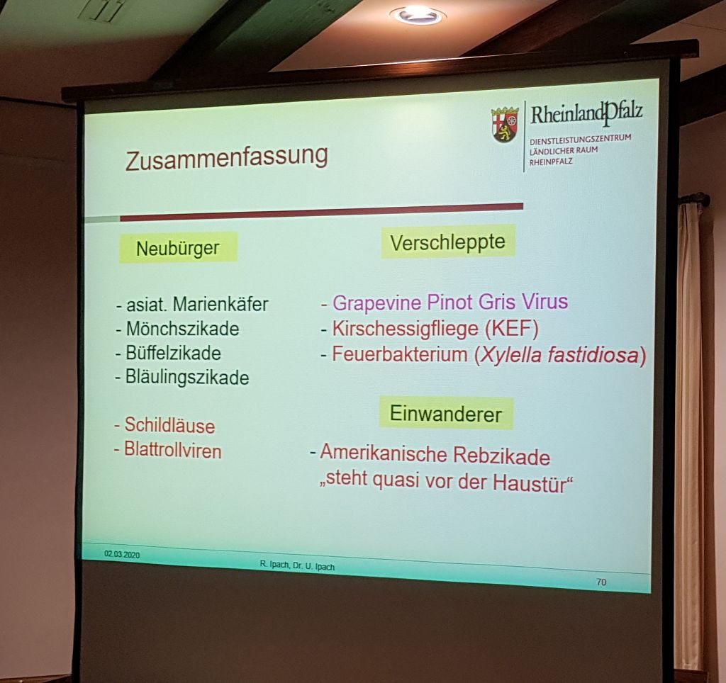Zum Abschluss des Vortrags wies WB Ipach noch darauf hin, dass weitere schadenbringende „Einwanderer“ noch „vor der Haustür“ stünden. Dazu zählt er den Bakterienüberträger „Amerikanische Rebzikade“, die eigentlich die klimatischen Gegebenheiten im Bereich des 45.Breitengrades bevorzugt. Im Zuge der Klimaerwärmung dürfte sie aber sicher den Weg nach Norden noch finden…!