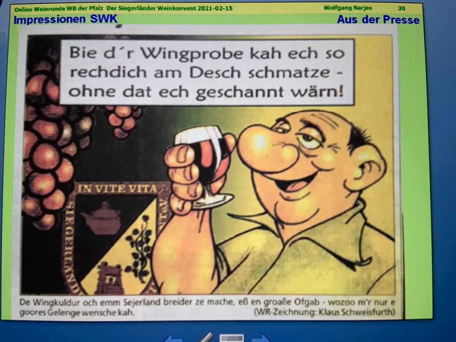 Wie eingangs bereits erwähnt, waren an diesem Rosenmontag auch vier Funktionsträger vom Siegerländer Weinkonvent zugeschaltet. Nachdem sich die Schatzmeisterin Petra Niewiera, Kellermeister Marc Weber und Konventskanzler Jürgen Schroer kurz vorgestellt hatten, informierte Konventsmeister Wolfgang Narjes mit Hilfe einer Power-Point-Präsentation über ihre Gemeinschaft. Diese besteht mittlerweile seit 40 Jahren und umfasst z.Zt. 120 Mitglieder. Ihre Ziele sind vergleichbar mit denen unserer Weinbruderschaft: Förderung der Regionalität und deren Kultur sowie Bekenntnis zur Weinkultur. Überrascht waren viele unserer Weinbrüder von der Vielzahl an Aktivitäten des Weinkonvents. Unsere Siegerländer Weinfreunde sind nicht nur an der Ausrichtung bzw. Teilnahme an mehreren Weinfesten beteiligt, sondern sie bieten auch Weinseminare an der Volkshochschule an und sind für einen (der Stadt Siegen gehörenden) Weinberg verantwortlich, in dem die Sorten Solaris und Regent angebaut und nach der Lese vinifiziert werden. Sollten die Aktivitäten unserer Weinbrüder aus dem Siegerland evtl. auch als Inspiration für unsere Weinbruderschaft dienen? Die Nach-Corona-Zeit wird es zeigen! Zum Abschluss seiner Ausführungen betonte WB Narjes die enge Zusammenarbeit des Siegerländer Weinkonvents mit zahlreichen Pfälzer Winzern und Weinhoheiten und letztendlich unserer Weinbruderschaft und wünschte sich einen noch möglichst langen Fortbestand dieser verbindenden Beziehungen.