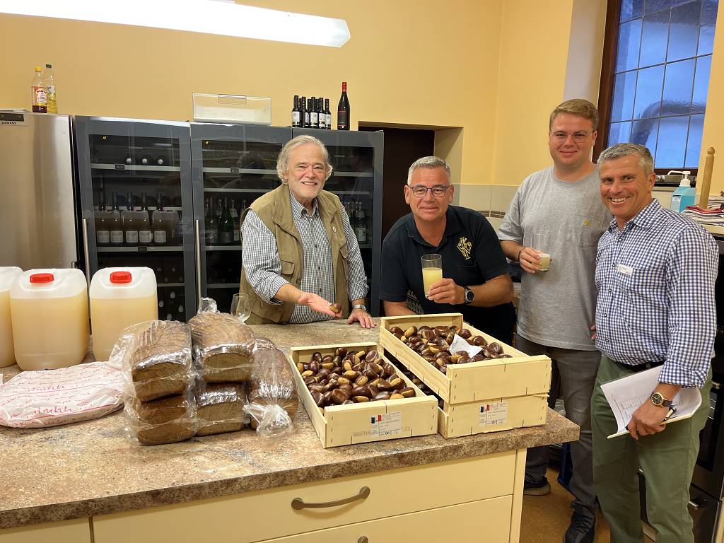 Aber: Es fehlten natürlich noch die Keschde! Als diese dann endlich von den Ordonnanzen portioniert ausgeliefert wurden, trauten manche Weinbrüder ihren Augen nicht: Das waren keine Keschde aus dem Pfälzer Wald, wie man sie kennt, sondern außergewöhnlich große französische Maronen in Aprikosengröße(!) mit einem hervorragenden Geschmack! Kein Wunder, dass die meisten Teller schon nach kurzer Zeit leer waren und Nachschub bestellt wurde. Für den sorgten, wie auch für den „alten“ und den „neuen“ Wein, unsere Ordonnanzen und zusätzliche freiwillige Helfer, die unermüdlich unterwegs waren, damit die Gläser und Teller nicht leer wurden!