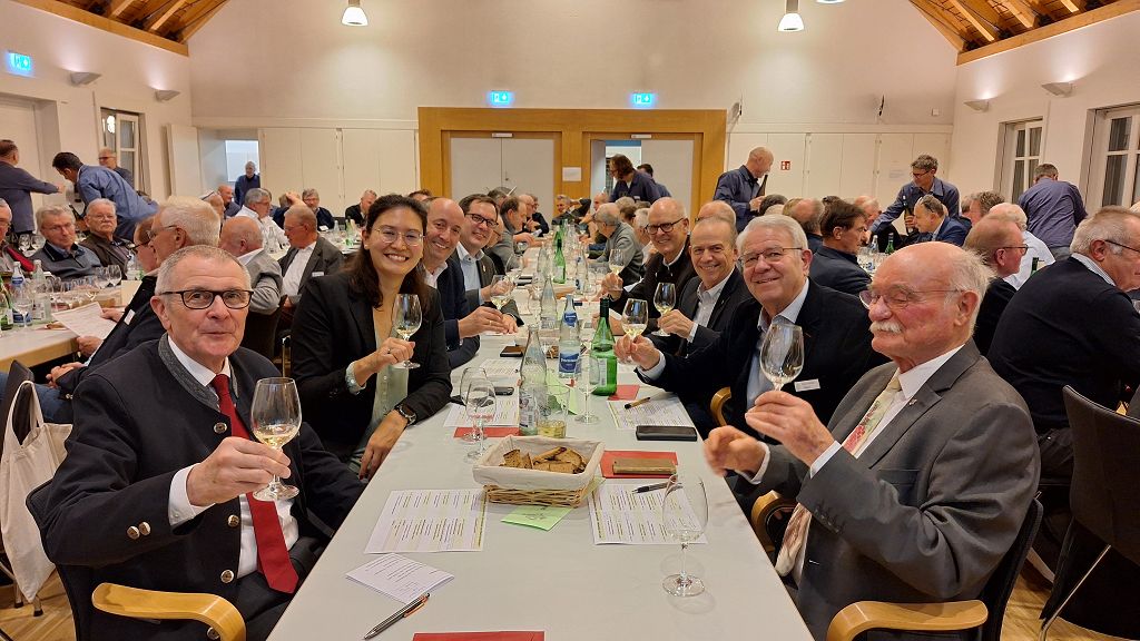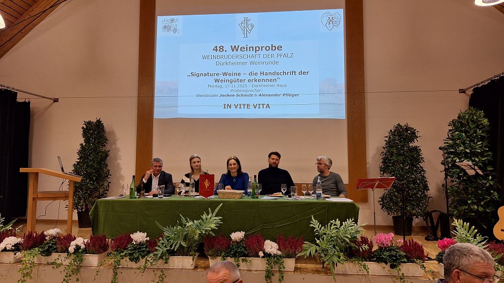 Als überaus gelungene Veranstaltung erwies sich wiederum die 48.Weinprobe der „Dürkheimer Runde“ am 17.11.2025. Perfekt organisiert von Kapitelmeister Frank Ortloff und seinem Helferteam erlebten die über 100 Teilnehmer, darunter zahlreiche Vertreter aus Politik, Gesellschaft und Weinbau, einige schöne Stunden im vollbesetzten Saal des „Dürkheimer Hauses“. Unter dem Motto „Signature Weine – die Handschrift der Weingüter erkennen“, gestalteten die beiden Probesprecher Jochen Schmitt und Alexander Pflüger, eine spannende Weinprobe mit durchweg anspruchsvollen Weinen von verschiedenen Dürkheimer Weinbaubetrieben. Wie sehr „Terroir“ und die „Handschrift des Winzers“ einen Wein prägen können, zeigte der erste Teil der Weinprobe: Jeweils vier „Chardonnay“- Weine und vier „Riesling“-Weine von verschiedenen Winzern wurden präsentiert und gekostet. Obwohl die Probierenden naturgemäß unterschiedliche Ansichten hatten, angetan waren sie von allen Weinen! Dasselbe galt auch für die im weiteren Verlauf des Abends vorgestellten Proben der Sorten Sylvaner, Scheurebe, Sauvignon Blanc, Spätburgunder und Cabernet Sauvignon Rosé.