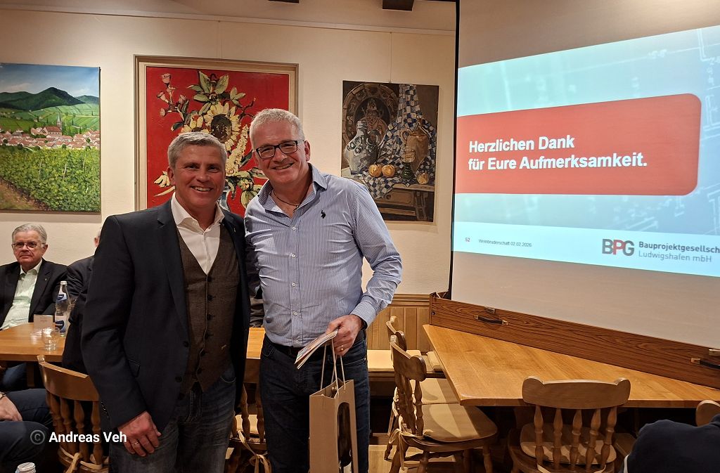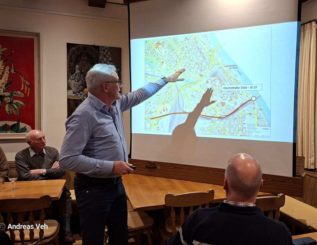 Ein außergewöhnliches Essensangebot und ein interessantes Vortragsthema lockten am vergangenen Montag ca. 90 Weinbrüder in unser Ordenshaus. Sie alle mussten ihr Kommen sicherlich nicht bereuen. Beides passte: Die vorzügliche Hirschhaxe mit passenden Beilagen (großes Kompliment an unser Küchenteam!) und der sehr interessante Vortrag zum Thema „Das Hochstraßensystem in Ludwigshafen“. Dieser wurde gehalten von einem absoluten Spezialisten, unserem Weinbruder Eberhard Küssner, der sich in seiner kurzen Vita als „Gesamtprojektleiter für das Hochstraßensystem Ludwigshafens“ vorstellte. Entsprechend professionell und profund erläuterte er in seinem ausführlichen Vortrag die Neugestaltung des Ludwigshafener Hochstraßensystems, insbesondere dessen nördlichem Teil: Abriss der derzeitigen Hochstraße einschließlich „Rathauscenter“ und „Würfelbunker“, Neubau der etwa ein Kilometer langen Stadtstraße, der „Helmut-Kohl-Allee“, bis hin zu deren Anbindung an die Kurt-Schumacher-Brücke („Nordbrückenkopf“). Immer wieder visualisiert durch entsprechende Bilder, Pläne und kurze Filmsequenzen, erklärte er äußerst detailliert u.a. die Abrissarbeiten, die Arbeiten „unter Tage und die anstehenden Straßen- und Brückenkonstruktionen. Dabei wies er auch auf zusätzliche Probleme hin, die im Vorfeld der eigentlichen Arbeiten bewältigt werden mussten, z.B. die Suche und das Entschärfen von Weltkriegsbomben oder die „Evakuierung“ einer großen Anzahl von Eidechsen und deren Wiederansiedlung auf Ersatzhabitaten („Eine Eidechse hat das Recht auf 80m² Wohnfläche“ ((Zitat Küssner)). Auch die bevorstehenden verkehrstechnischen Probleme und ihre Lösungsmöglichkeiten waren ein Teil seines Vortrags.